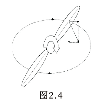 无人机电机带动螺旋桨顺时针运动,桨叶螺距对空气作用的效果会产生一个向下的推力与水平方的推力。(如图2.4)