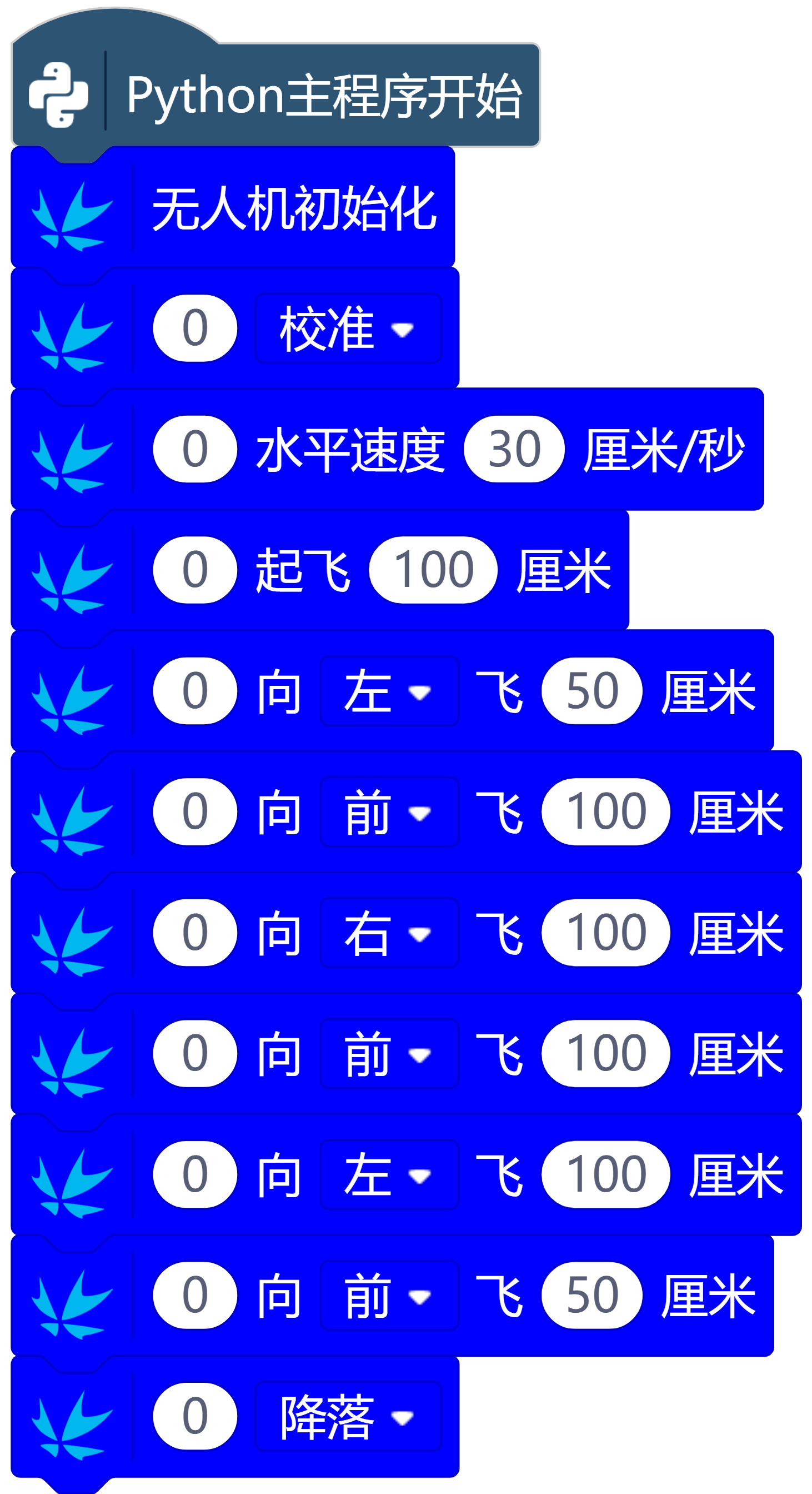 结合场地实际距离,我们可以很容易的编写出飞行控制程序。默认设置下,无人机使用光流模式进行飞行。